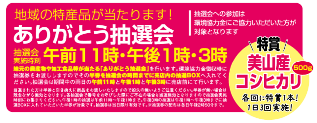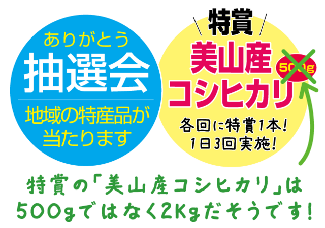チラシやポスターなどでお知らせしていたありがとう抽選会特賞のお米「美山産コシヒカリ500g」ですが、特賞は「美山産コシヒカリ2Kg」との訂正情報が入りましたのお知らせします!